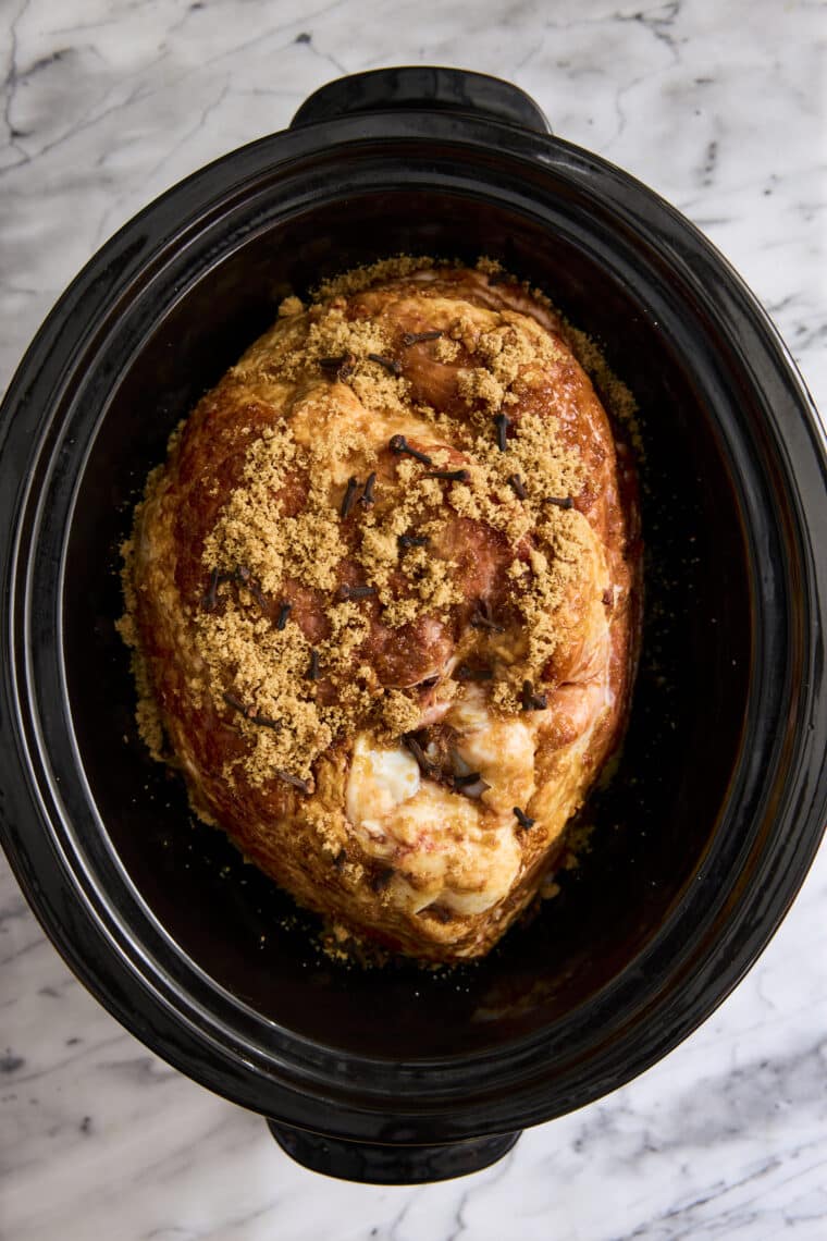 - Place ham into an 8-qt slow cooker. Sprinkle with brown sugar, rubbing in thoroughly on all sides. Place whole cloves throughout the ham.