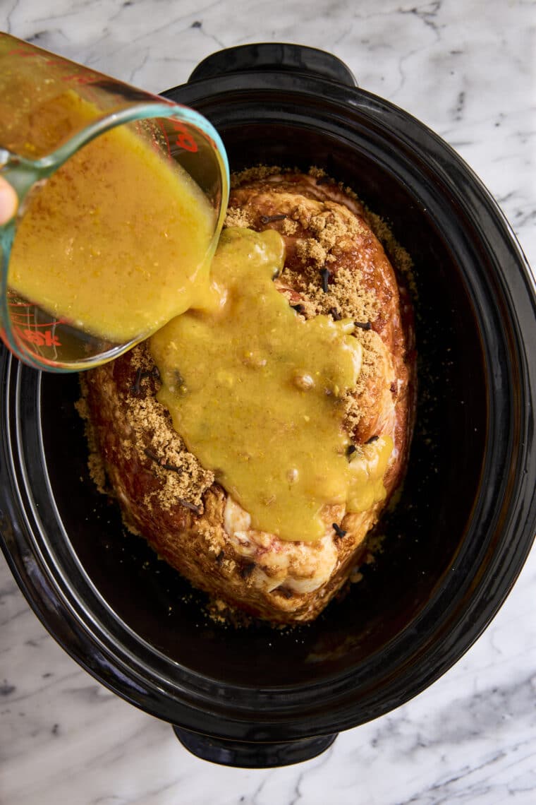 - Mix the orange glaze + pour over the ham