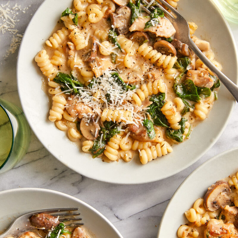 There’s just one pot and a few ingredients between you and dinner tonight. We’re talking tender chicken bites and a luscious, garlicky creamy pasta sauce with sneaked in greens for a one-and-done meal. Not to mention, so many less dishes to clean, a true weeknight hero.